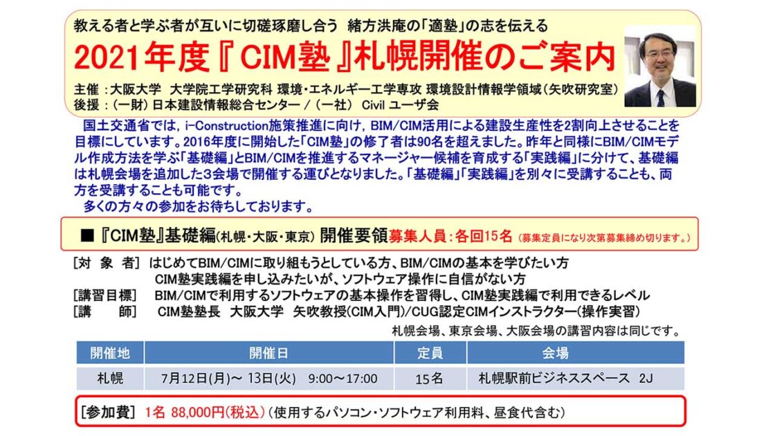 2021年度の CIM塾基礎編(大阪会場、東京会場、札幌会場)、CIM塾実践編(東京会場、web) を開催いたします。 6/10,11 CIM塾基礎編(大阪会場) 6/29,30 CIM塾基礎編(東京会場) 7/12,1 …続きを読む →