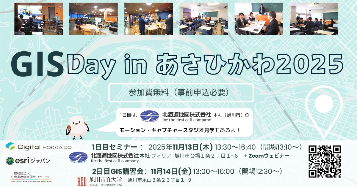 昨年は『旭川のまちづくりと地理空間情報』~観光分野や交通・建設分野におけるGISやドローンの利活用~というテーマでGIS Day in 旭川2024が開催され、会場の北海道地図本社には40名以上が集い、オンラインでも230名程が視聴されました。本年は、「旭川のまちづくりと地理空間情報」(PARTⅡ)」と題して昨年に引き続き開催いたします。